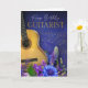 Diese Geburtstagskarte zeigt einen tief königsblauen Hintergrund mit eleganten goldenen Noten, die diagonal über das Design angeordnet sind und eine reiche musikalische Atmosphäre schaffen. Der Text "Happy Birthday Guitarist" erscheint oben in einer Mischung aus goldener Serif- und weicher Script-Typografie. Links steht eine detaillierte akustische Gitarre prominent, teilweise gerahmt, was der Karte eine realistische instrumentale Präsenz verleiht. Der untere Rand ist mit einem lebendigen Cluster aus blauen, violetten und lila Blumen dekoriert, was Kontrast und ein künstlerisches, festliches Gefühl hinzufügt. Eine perfekte Grußkarte für Gitarristen, Musiklehrer, Bandmitglieder, Studiomusiker, Hobby-Gitarrenspieler, Bühnenkünstler und alle, die leidenschaftlich gerne Gitarre spielen.
