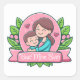 Adorable Aufkleber ideal für den Muttertag. Eine niedliche Abbildung einer Mutter und ihres Kindes, die einander eine liebevolle Umarmung geben. Beide tragen ein blaues Shirt und haben braune Haare. Beide haben ein liebevolles Lächeln und rosige Wangen. Sie sind Set in einem rosa Kreis mit Glitzern und zwei Lieben Herzen, die sich herumreißen. Unten ist ein rosa Banner mit einem eleganten Skript, das 'Beste Mama je' liest, dieses ist eine Vorlage, die verwendet werden kann, wie es ist oder ersetzen Sie den Originaltext mit Ihrem eigenen, um personalisieren. Um den Kreis und das Banner sind grüne Blätter und rosa Blume. Ein hübsch zeichnend Ideal für deine Mutter.