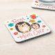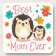 Adorable Untersetzer für die Leckerei einer Mutter mit einer niedlichen Abbildung eines Igels, der die Hand ihres Igels hält. Der kleine Igel hält ein rosa Liebe. Beide Igel haben dunkelbraune Stacheln und einen bräunlichen Körper, jede hat rosige Wangen, glänzende Augen und ein wenig Lächeln. Über den niedlichen Tieren schweben farbenfrohe Blume in Blau, Gelb und Rot. Fun rosa Schriftart oben und unten lautet die Abbildung "Beste Mama je".