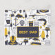 Zum Vatertag. "Bester Vater" in Gold auf blauem Rechteck. Ein Muster von Angelausrüstung wie Fisch, Haken, Eimer, Netz, Bootsmotor, Stab und Rollen und vieles mehr. Ideal für den Fischen