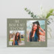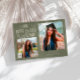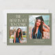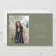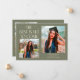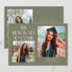 Moderne und verspielte Abschlussanzeige mit 2 Fotos auf der Vorderseite und 1 auf der Rückseite. Der Text lautet "Das Beste kommt noch" mit funkelnden Sternen. Fügen Sie den Namen des Absolventen, Informationen und eine persönliche Nachricht hinzu, um diese Karte zu personalisieren. Sage-grüne Farbe.
