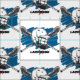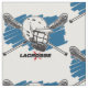Mutiger Lacrosseentwurf mit Lacrossesturzhelm und gekreuztem Lacrosse haftet mit blauem Hintergrund. Senken Sie den LACROSSE, der mit rotem x-Kreuz lässt. Großes Lacrossegeschenk für Lacrossespieler und -fans!