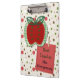 Dieses ist ein niedliches Klemmbrett für einen Lieblingslehrer. Es kennzeichnet einen hellen roten halben Apfel mit grünen Samen und Blätter, und gerahmt mit einem grünen und weißen Gingham-Karomuster. An der Unterseite ist eine rote Anmerkung, die mit einem Kleidungs-Buttonbild befestigt wird, das Ihren kundenspezifischen Text hält. Die Bilder werden beide auf einen roten, grünen und weißen Tupfenhintergrund des Spaßes gesetzt. Die Rückseite des Klemmbrettes hat das gleiche Muster wie die Front. Niedlich und einfach zu personifizieren. *Klipp Kunst, die in diesem Entwurf verwendet wird, ist durch Encore Software, Inc. urheberrechtlich geschützt, der Gebrauch zu seinen Lizenzgebern ermöglicht. Alle Rechte vorbehalten.