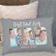 Dieses Kissen für Vater ist mit drei Fotovorlagen in Form des Wortes VATER auf grauem Hintergrund dekoriert. Es heißt "Bester Vater je" und das Jahr. Der Text und die Fotos sind anpassbar.
