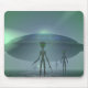 Außerirdische mit einem saucer-förmigen Raumschiff