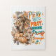 Friedliches, farbenfrohes Design mit einer Herbst/Herbst-Szene mit majestätischen Löwenkopf, Kürbisse und Herbst-Blume. Der farbenfrohe inspirierende Text lautet: "Betet darauf, betet darüber, betet durch ihn". Dieses Design ist auf einer Vielzahl von Produkten erhältlich.