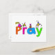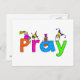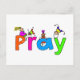 Niedliche Cartoon Illustration von glücklichen und vielfältigen kleinen Jungen und Mädchen, die über gigantische Buchstaben des Alphabets klettern, die das Wort PRAY ausdrücken. Bilder auf verschiedenen Geschenken und Produkten erhältlich. Postkarten.