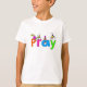 Niedliche Cartoonillustration der glücklichen und verschiedenen kleinen Jungen und die Mädchen, die über riesigen Buchstaben des Alphabetes klettern, die das Wort formulieren, BETEN. Bild verfügbar auf verschiedenen Geschenken und Produkten. T - Shirts. Kapuzenpullis.