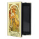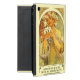 Anpassung eines Kunst Nouveau lithograoh durch Alphonse Mucha betitelte Blume, 1897. Biblischer Text vom Evangelium von Matthew-6:28,29, in dem Jesus zu seinen Schülern sagte, "betrachten Sie die Lilien des Feldes, wie sie wachsen; sie plagen nicht, keine tun sie spinnen ab. Und doch sage ich an Sie, dieser sogar Solomon in seinem ganzem Ruhm wurde gekleidet nicht wie eins von diesen." Blumenentwurf mit Lilien-Blumen und schöner Frau in Kunst nouveau Art in den Schatten des Goldes, des Gelbs und des Grüns. Wiedergabe der feinen Kunst mit Inspiration und Ermutigung von der christlichen Glauben-Schenkungssteuer.