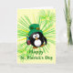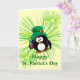 Benutzerdefinierte Karte mit einem betrunkenen Pinguin mit einer Flasche Schnaps. Funny St. Patrick's Day. Entworfen von Janet Palaggi