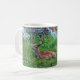 Ein Foto eines männlichen Hirsches, das sich im Gras und in Wildblumen niederlegt, die in einem Wald unter einer natürlichen Steinmauer wachsen. Dieses nah-up Foto eines männlichen Hirsches ist der gleiche Buck in meinem Foto mit dem Titel "A Buck Erholungen at a Cascading River". Image Copyright© 2018 Kimberly J Tilley.