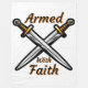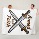 Diese Vlies-Decke zeigt die Wörter "Bewaffnet mit dem Glauben" in einer einmaligen Druckfront mit schwarzen Buchstaben orangefarbener Kontur mit einem Set von Schwertern, die in der Mitte mit diesem religiösen Zitat-Thema überkreuzt sind. Dieses Blanket besteht aus 100% schmetterlicher, weicher und gemütlicher Polyester-Fleece mit modernem, lebendigem Vollfarbendruck und Doppelkantenstich mit weißer Rückmaschine, waschbar.