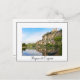 Postcard mit Schloss und Dorf Beynac-et-Cazenac gebaut auf den Klippen entlang des Flusses Dordogne am frühen Morgen mit Reflexion im Fluss und ein Kajak im Vordergrund. Die Stadt liegt im Perigord in Frankreich. Es hat einen weißen Rahmen und den Text "Beynac-et-Cazenac".