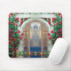 Schöne rote Rosen, die ein zauberhaftes Fenster mit Blick aufs Meer umrahmen... Der entzückte Garten ist ein Fantasy-Ort, wo Sie sich entspannen können ...