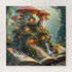 Eine zauberhafte Szene mit Feen in einem Wald mit einem pilzförmigen Haus, einem Wasserfall und einer musikalischen Aufführung, die eine bezaubernde Atmosphäre inmitten einer detaillierten natürlichen Umgebung schafft.