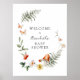 Herzlich willkommen in Ihrer Babydusche mit diesem hübschen Schild, das einen Kranz aus Grün, Waldpilzen und Wildblumen aufweist. Fügen Sie den Ehrengast mit dem Namen, dem Duschdatum und dem persönlichen Willkommenstext unter Verwendung der angegebenen Felder hinzu.