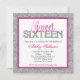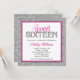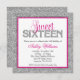 Eine moderne 16. Geburtstag-Geburtstags-Party Einladung. Einen silbernen Glitter des Imitats kennzeichnend, entwerfen Sie mit Akzenten des heißen Rosas und des Schwarzen. Entwürfe sind Ebene Druckgraphiken - NICHT TATSÄCHLICHER GLITZER.