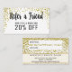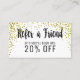 Verweisen dieses moderne und bezaubernde Imitat Druckgold gesprenkelter Glitter auf Weiß, einen Freund, Rabattempfehlungs, diekarte für den trendy und stilvollen Geschäftsinhaber perfekt ist. Diese moderne und berufliche schauende Karte ist die perfekte Weise, Ihre Kunden zu zeigen, die Sie für ihr Geschäft sich interessieren. Fertigen Sie diese Karte für jedes mögliches Geschäft besonders an, einfach redigieren Sie den Text und addieren Sie Ihre eigenen persönlichen Details.