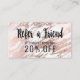 Verweisen dieses moderne und bezaubernde Imitat DruckRosengold und weißes Marmormuster, einen Freund, Rabattempfehlungs, diekarte für den trendy und stilvollen Geschäftsinhaber perfekt ist. Diese moderne und berufliche schauende Karte ist die perfekte Weise, Ihre Kunden zu zeigen, die Sie für ihr Geschäft sich interessieren. Fertigen Sie diese Karte für jedes mögliches Geschäft besonders an, einfach redigieren Sie den Text und addieren Sie Ihre eigenen persönlichen Details.