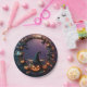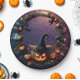 Diese faszinierende Halloween-Illustration zeigt eine zentrale glühende Jack-o’-Laterne mit einem Hexenhut. Um den Kürbis herum befinden sich verschiedene Elemente, die Halloween betreffen, darunter Geister, Fledermäuse, Spinnennetze, die sich über Noten, Kerzen und Herbstblätter erstrecken. Die Farbpalette ist vorwiegend düster, mit orangefarbenen Pop aus Kürbissen und blassen Elementen wie Geistern und Kerzen, die Kontrast schaffen. Diese Teller eignen sich hervorragend, um jedem Anlass eine Touch Halloween-Magie hinzuzufügen. Sie sind ideal für Party und Feiern.