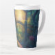 Die künstlerische latte Tasse zeigt ein von der künstlerischen Intelligenz generiertes digitales Kunstbild eines magischen Waldgartentors mit Sonnenstrahlen im Hintergrund.
