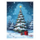 Ein majestätischer Weihnachtsbaum steht im Mittelpunkt, mit glitzerndem Schnee und lebhaften roten Ornamenten geschmückt und mit einem goldenen Stern gekrönt. Umgeben von einer ruhigen Winterlandschaft und flankiert von Geschenken in fröhlichen Farben, vereint dieses Bild die magische Essenz von Weihnachten. Der sanfte Schneefall und das ruhige Ambiente der schneebedeckten Bäume im Hintergrund schaffen eine friedliche Kulisse, die sich perfekt für den Urlaub eignet.