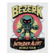 Vibrant retro-style illustration featuring a fierce pixelated robot from a classic 1980s arcade game parody, with "BEZERK" at the top and "INTRUDER ALERT WORLD TOUR" below. This bold, neon-colored design captures the essence of vintage Berzerk-inspired gaming culture, complete with lightning effects and an aggressive robot pose – perfect for fans of retro video games, pixel art, and 80s nostalgia.