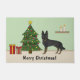 Desteis originelle Cartoon-Illustration eines schwarzen, zweifarbigen deutschen Schäferhundes. Der Hund wird von einem festlichen Weihnachtsbaum stehend, der mit roten und gelben Ornamenten verziert ist, einer Perlgarage und einem gelben Stern, der auf dem Baumgipfel steht. Es gibt auch zwei Geschenke vom Baum umwickelt und hinter dem Hund gibt es ein braunes Regal mit zwei Kerzen. Der Boden ist beige, die Hintergrundfarbe hellgrün. Es gibt auch einen personalisierbaren Textbereich, der jetzt lautet: "Frohe Weihnachten!".