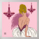 Unsere schöne Bianca mit blonden Haaren, in Weiß und Rose gekleidet. Bianca ist mit Juwelen geschmückt und hat einen staubigen, gefederten Ventilator an der Rose. Burgundy Kronleuchter auf einem hellrosa Hintergrund.