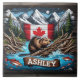 Ein Biber baut einen Damm in einem lebendigen Fluss, umgeben von Bergen und einer kanadischen Fahne, und zeigt den natürlichen Lebensraum in einer landschaftlichen Landschaft.