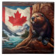 Ein Biber sitzt auf einem Baumstamm neben einem Fluss, gerahmt von einer atemberaubenden Bergwelt und der kanadischen Fahne im Hintergrund.