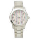 Diese Frauenuhr ist in einem modernen Design aus der Mitte des Jahrhunderts mit sich wiederholenden Rechtecken in aquamarin, orange, rüben und orange auf einem weißen Feld gestaltet. Wenn Ihnen das Design gefällt, aber andere Farben bevorzugen, dann schreiben Sie mir.