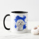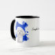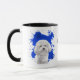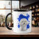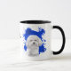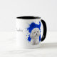 Ein wunderschönes Aquarellbild eines zauberhaften weißen Bichon Frise hebt sich vor einem hellblauen abstrakten Spritzer-Hintergrund ab. Das Bild befindet sich auf zwei Seiten der Tasse, mit Ihrem Namen oder einem anderen benutzerdefinierten Text in schwarz.