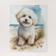 Niedlicher Bichon Frise Hund auf dem Strand Kunstwerk in Aquarell.