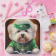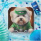 Ein wütender Freund hinter den Lenkern eines glänzenden grünen Fahrrads, das ein grünes Saint Patrick's Day Outfit trägt, das den Kopf dreht. Der Hund ist in einem festlichen Ensemble gekleidet, das mit einer grünen Bogen-Krawatte und einem passenden Oberhut versehen ist, der sich schmutzig über dem Kopf befindet. Das Outfit zeichnet sich durch die aufwändigen Entwürfe von Kleeblättern und Kobolden aus und macht deutlich, dass dieser Hund bereit ist, den St. Patrick's Day im Stil zu feiern.