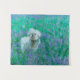 Tapisserie mit handgezeichneten Kunstwerken eines Bichon-Frisörs in einem Feld von Bluebonnets. Kunstwerk: Farbstift. Copyright: Dominic A. White. Alle Rechte vorbehalten.