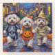 Adorable Bichon-Krawatten, die in verspielten Halloween-Kostümen gekleidet sind, tragen Kürbiseimer, während sie unter dem mondbeleuchteten Himmel tricksen oder behandeln. Dieses festliche Design hebt den flauschigen weißen Mantel der Rasse, den fröhlichen Geist und die liebevolle Persönlichkeit hervor, die perfekt die sprichwörtliche und dennoch lustige Atmosphäre Halloween-Abends einfangen. Eine charmante Feier für Hundefreunde und Halloween-Fans gleichermaßen.