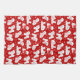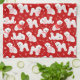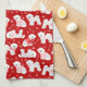 Niedlicher Valentinstag Bichon Frise Hunde mit roten, rosa und weißen Polka Dot und Herzpullover mit verstreuten Pfotendrucken und Pfeil auf rotem Hintergrund.