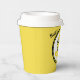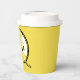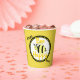 Bee Happy ist in gelber Goldtypografie geschrieben. Lächelnde gelbe Hummel mit schwarzen Streifen und flatternden Flügeln. Buzz ist auf beiden Seiten des geometrischen, runden, schwarzen gelben Randes geschrieben. Original Artwork © TamiraZDesign.