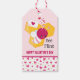 Geschenke Tags mit einem bezaubernden Bild einer rosa und weiß gestreiften Hummel. Ein Stück gelbe Wabe dahinter. Ein Brief, der mit einem Herz versiegelt ist, und eine Gruppe schwimmender Herzen sind ebenfalls Teil des Designs. Der bearbeitbare Text sagt: Bee Mine. Rosa und grüne Herzen verlaufen unten entlang.