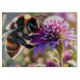 Eine lebendige Biene schwebt delikat über einer blühenden lila Blume. Der gestreifte Körper der Biene kontrastiert mit den weichen Blütenblättern und unterstreicht die Schönheit der Bestäubung.