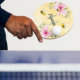Gelber, weißer Hintergrund mit Wabenmuster. Blume mit rosa tropischen Blumen, Hibiskus und Hummeln. Geben Sie Ihren Namen und den Monogramm-Buchstaben ein. Grüne und schwarze Buchstaben. Ideal für Ihren Sommerurlaub im Haus.