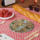 hübsche Bienen auf brauner und gelber Seite machen ein Picknick