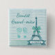 Bientôt Grand-mère Baby Shower Button Oma zu sein, mit aquamarinem Eiffelturm Hintergrund mit kleinen Babyspuren und Bogen