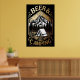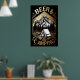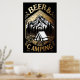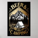 Eine grafische Abbildung zeigt eine Bergkette mit einem Campingplatz an der Basis. Ein Zelt steht vor einem knisternden Lagerfeuer und eine Bierflasche Erholungen auf dem Boden. Die Szene wird durch ein sechseckiges Design mit dem Text Beer & Camping in einem Goldskript gerahmt.