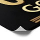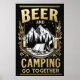 Eine Schwarz-Gold-Abbildung, die eine Bergszene mit einem Zelt, zwei Biersorten und dem Text Bier and Camping Go Together darstellt.