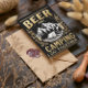 Eine Schwarz-Gold-Abbildung, die eine Bergszene mit einem Zelt, zwei Biersorten und dem Text Bier and Camping Go Together darstellt.