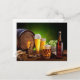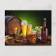 Bierfass mit Bierbrille auf einem Holztisch Postkarte