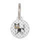 Desteis originelle Cartoon Illustration eines niedlichen Biewer Terrier / Biewer Yorkshire Terrier Zuchthundes. Der Hintergrund weist ein Muster grauer Hundepfoten auf. Auf der anderen Seite gibt es personalisierbare Textbereiche für einen Namen und für die Telefonnummer des Besitzers.