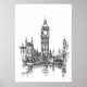 Eine originelle Schwarz-Weiß-Skizze von Big Ben London von dem englischen Künstler Terry Donnelly, die die Themse und die London Bridge zeigt